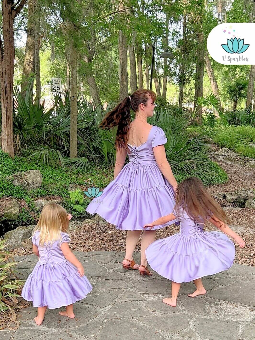 Base Purple Twirl Dress for Girls – Matching Mother and Daughter Outfit – Create a magical matching mother and daughter Disneybounding look with this Rapunzel-inspired base purple twirl dress for kids. Perfect for toddler girls for Halloween costumes or special occasions.