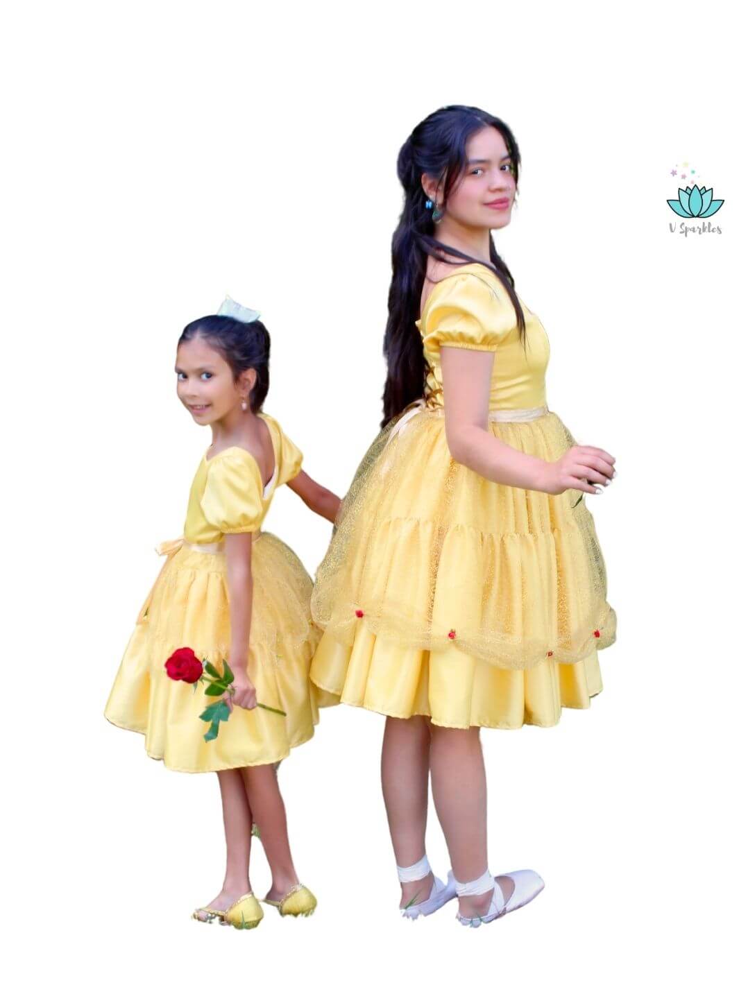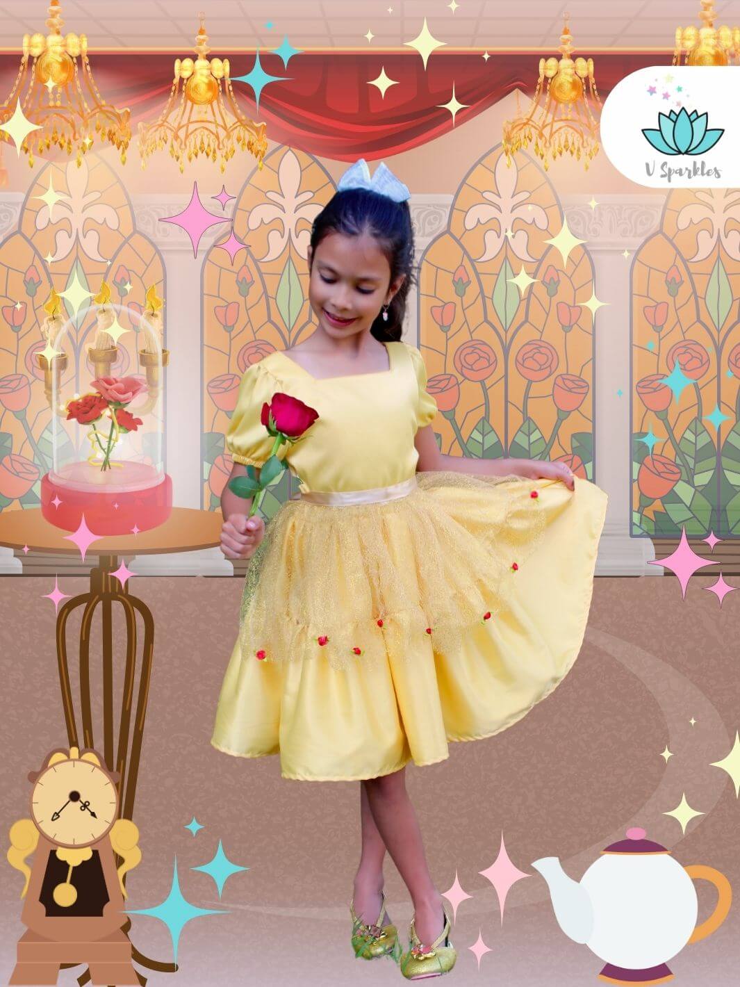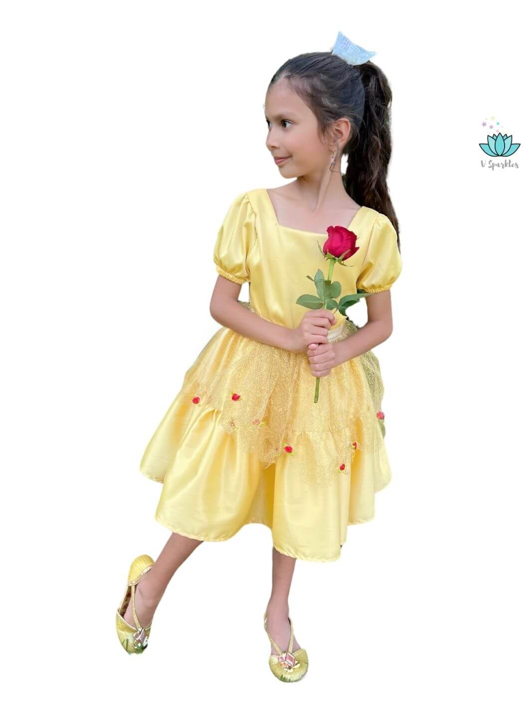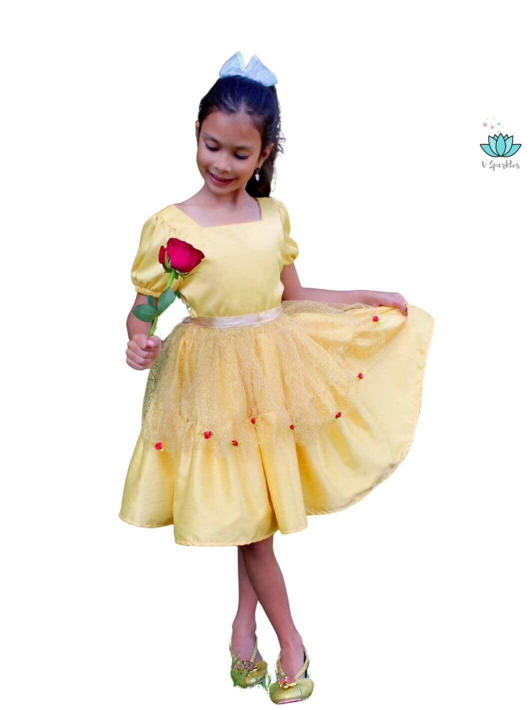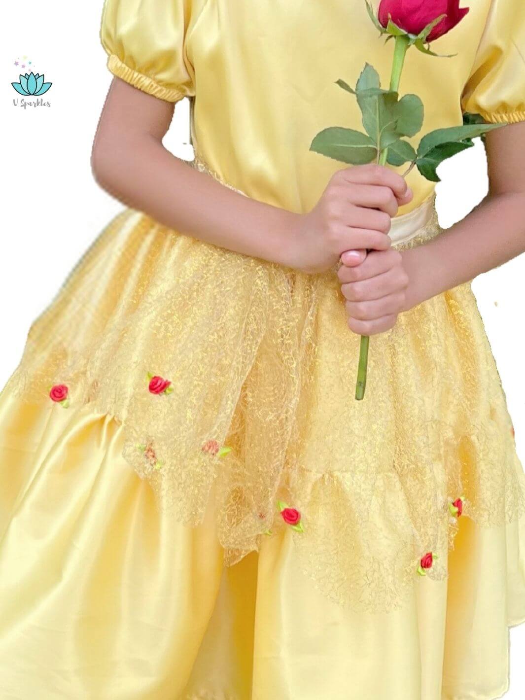 • The shimmering golden tulle adorned with delicate red roses captures the magic of a classic fairytale, making your little one feel like they’re living in a storybook.