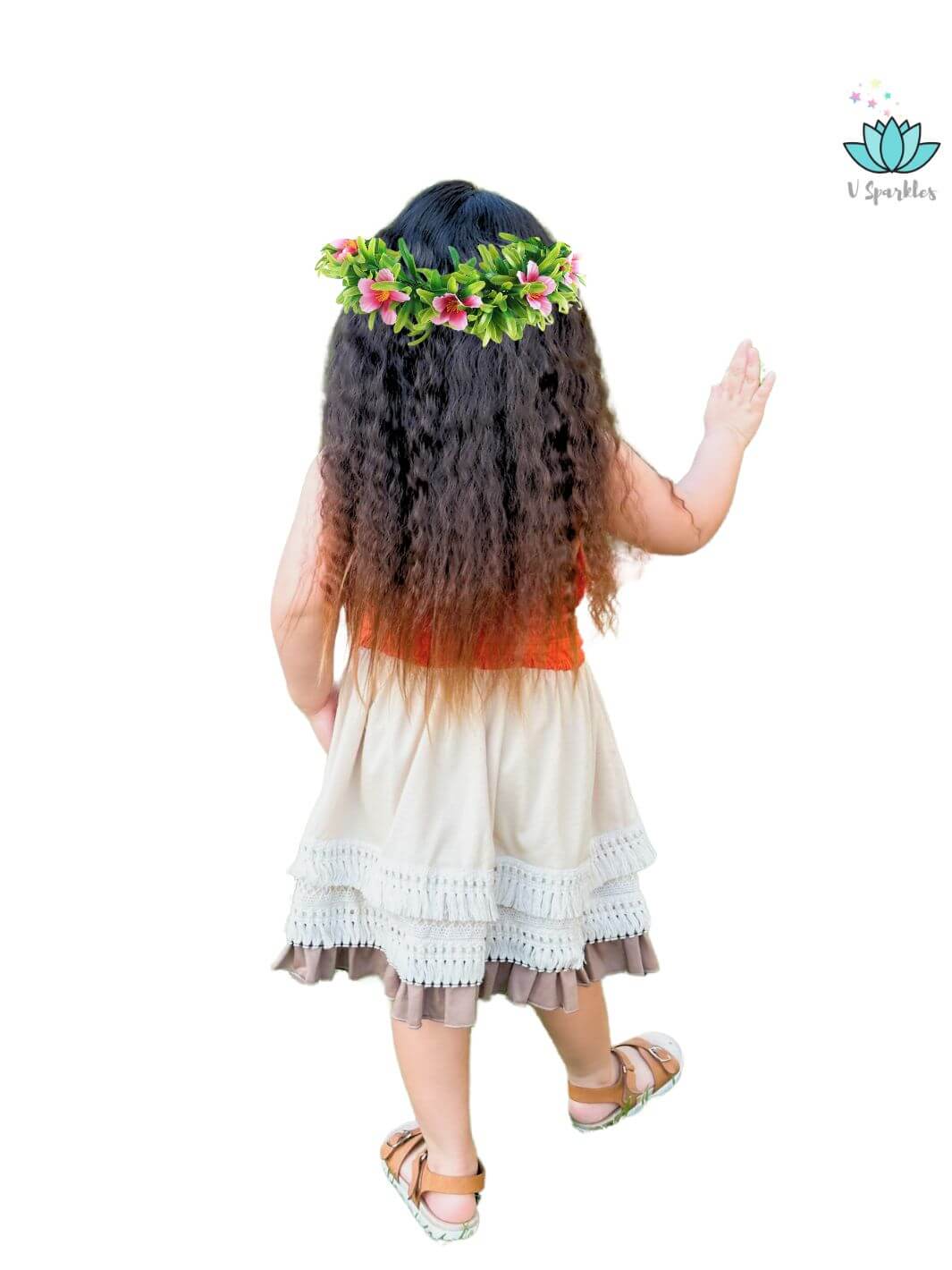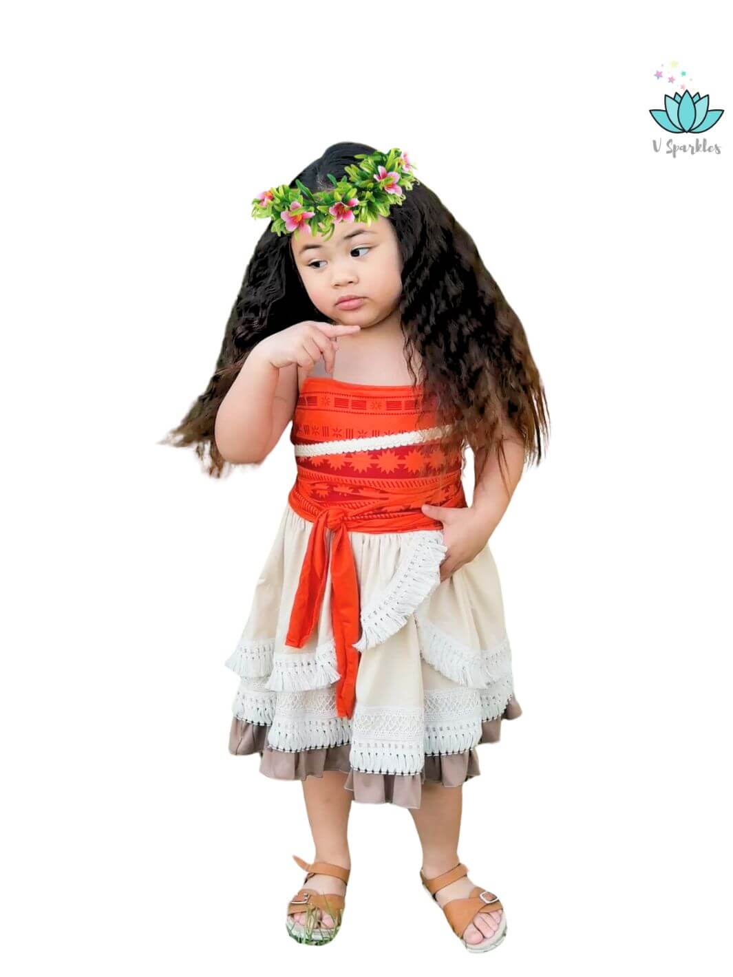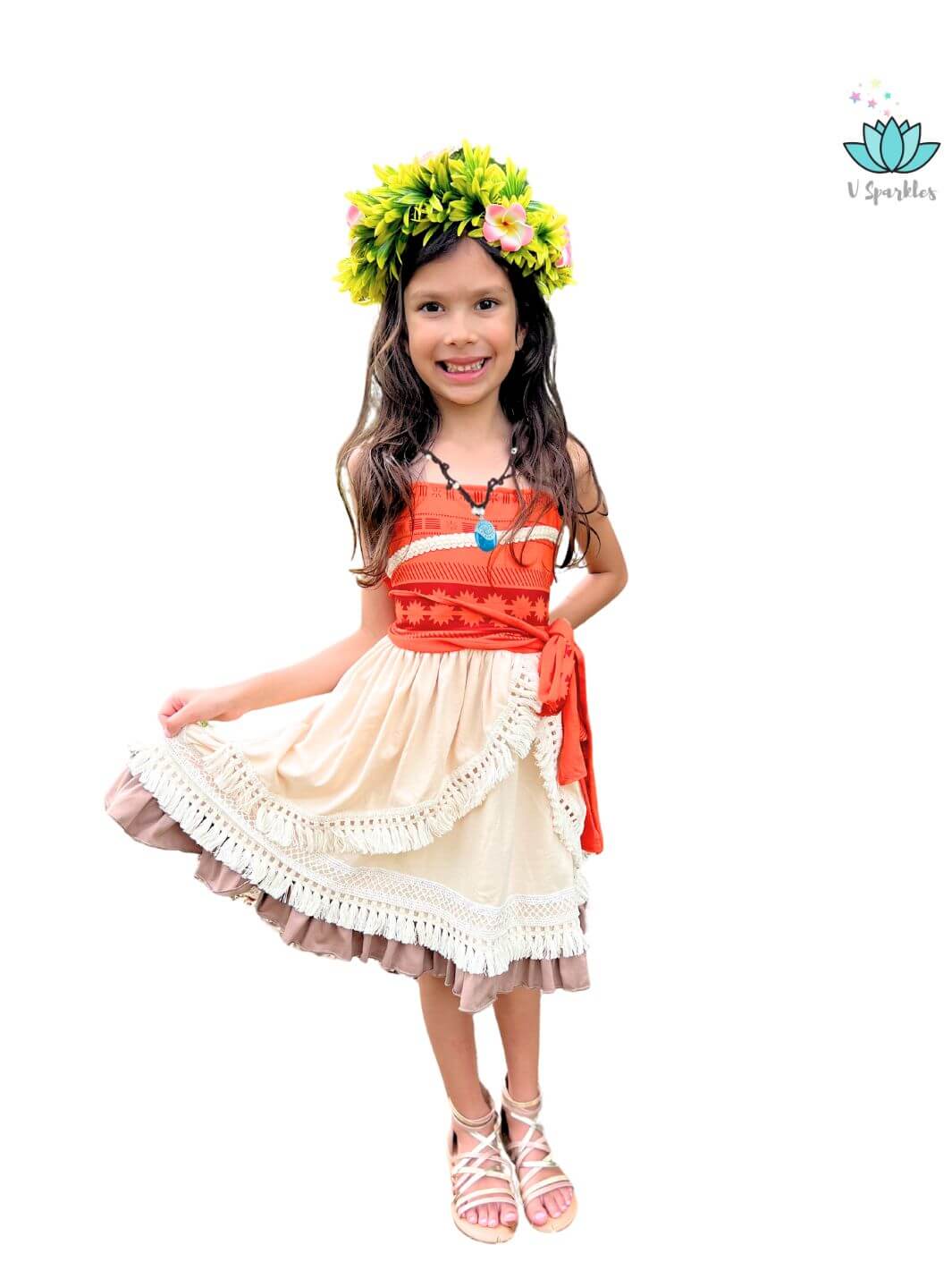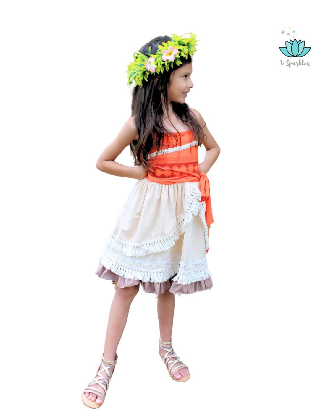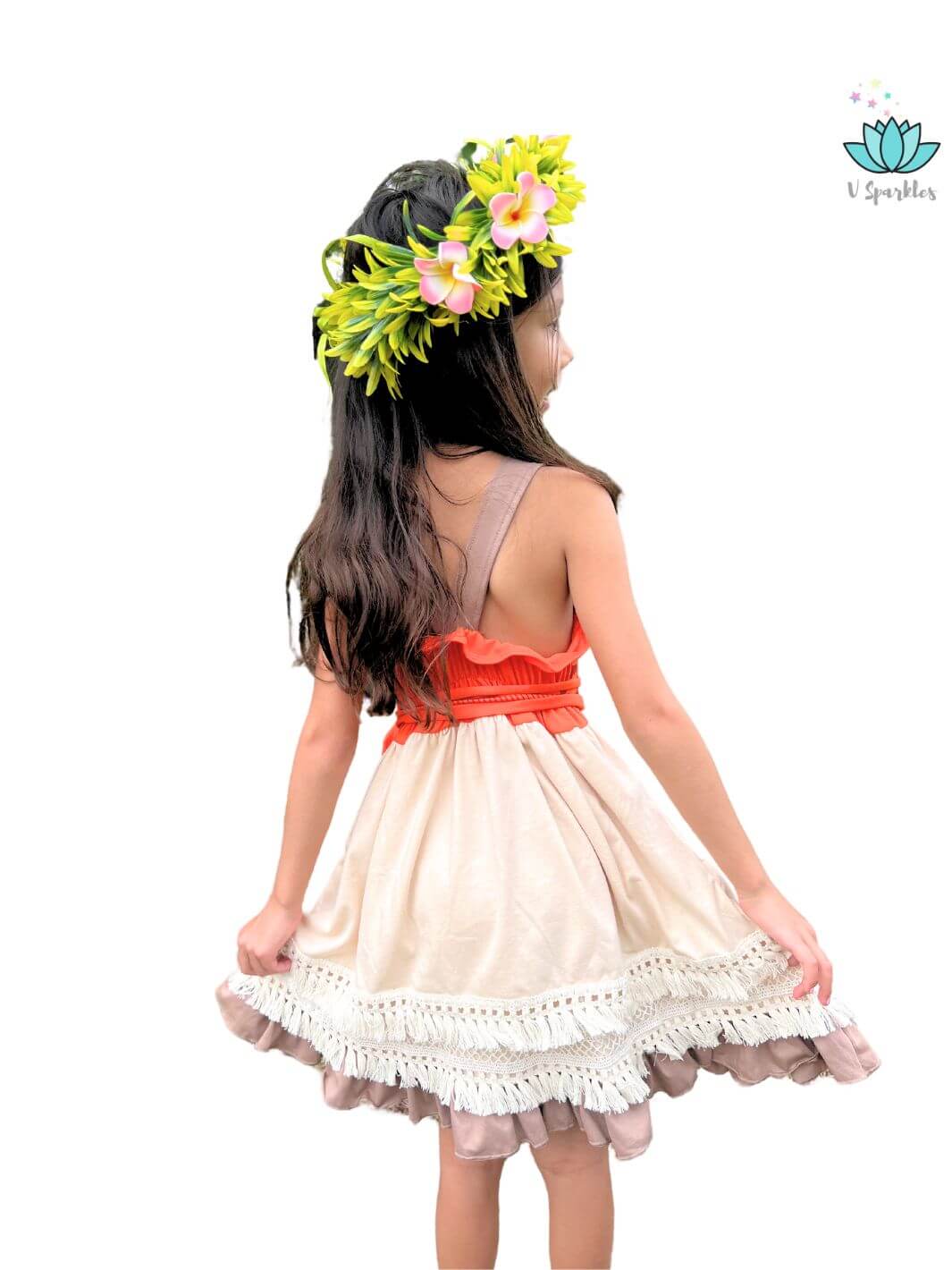 Our Island Princess dress has a bright orange bodice with a custom print and a beautiful trim, the skirt part has a custom-crafted cotton trim all around the skirt and an extra layer for a deluxe and beautiful look. It comes with a matching sash.