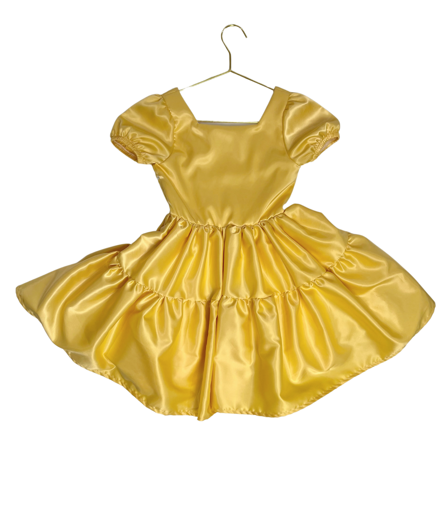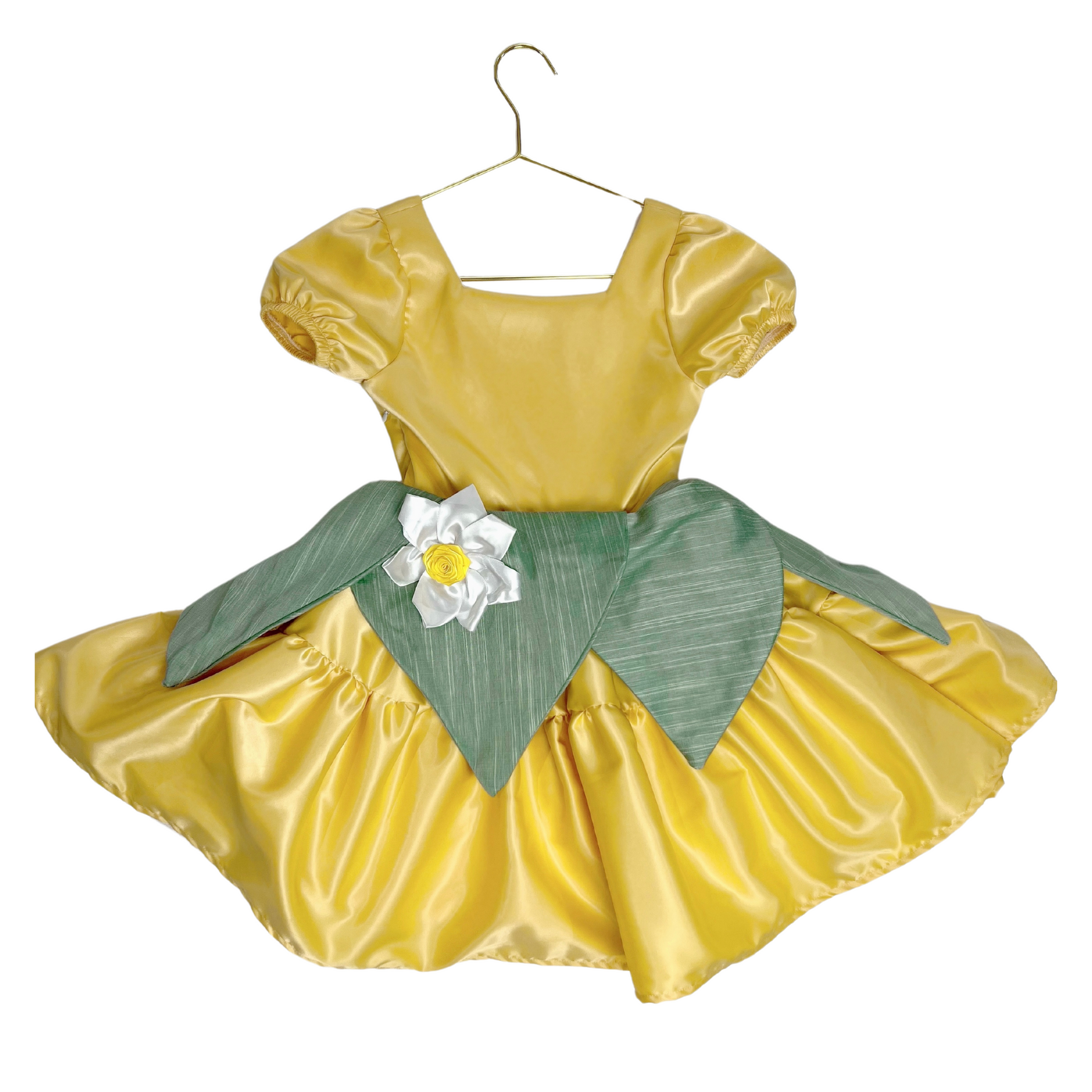 • Enchanting Design: A beautiful golden dress adorned with a charming green, princess-themed apron and a delicate flower, adding a touch of royal flair.