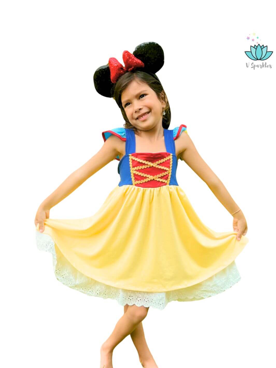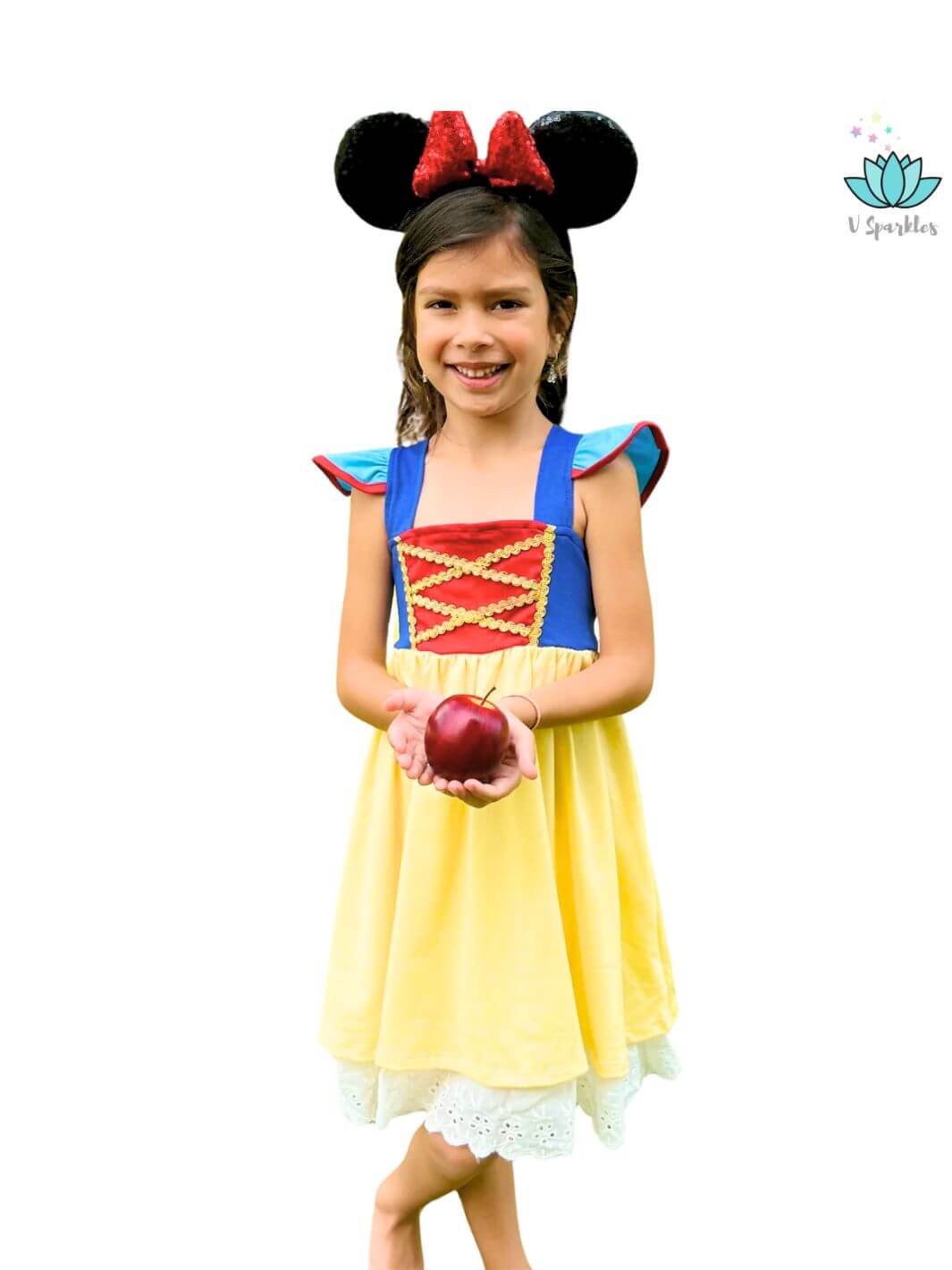 Snow White Play Pretend Dress for Kids: A beautiful Snow White dress for kids, perfect for play pretend, dress-up games, and birthdays. Ideal for a Disneybound outfit or a special gift for young Disney fans.